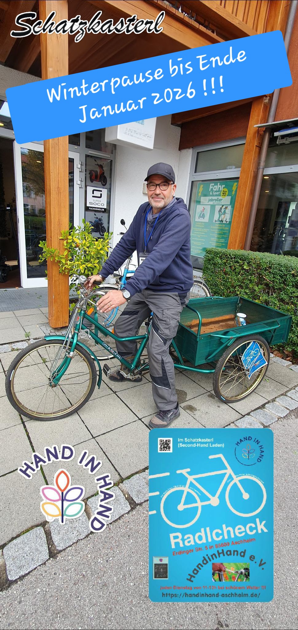 Und Anfang 2023 haben wir unseren Traum verwirklicht und haben mit der Hilfe vieler Ehrenamtlicher in Aschheim einen Second Hand Laden mit Treffpunkt eröffnet, unser Schatzkasterl. Infos hier.