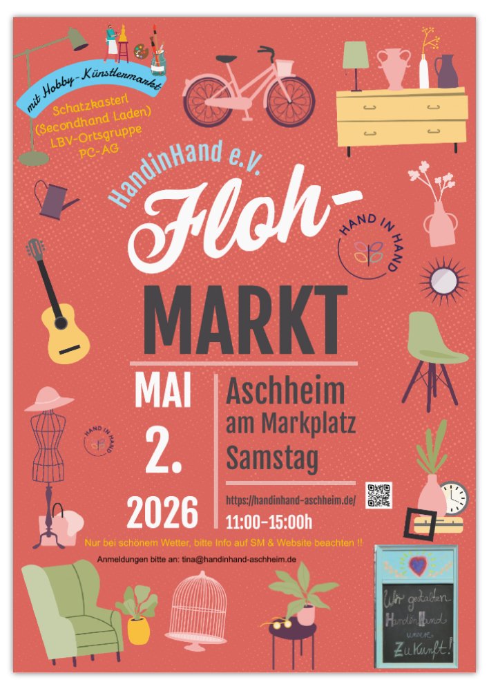 Veranstaltungen wie Flohmärkte, Friedensfest, Sommerfest, White Dinner und ein Reapircafé zusammen mit Teamwerk und der PC AG führen wir jährlich in Aschheim durch, um Orte der Begegnung und der gegenseitigen Unterstützung zu schaffen.